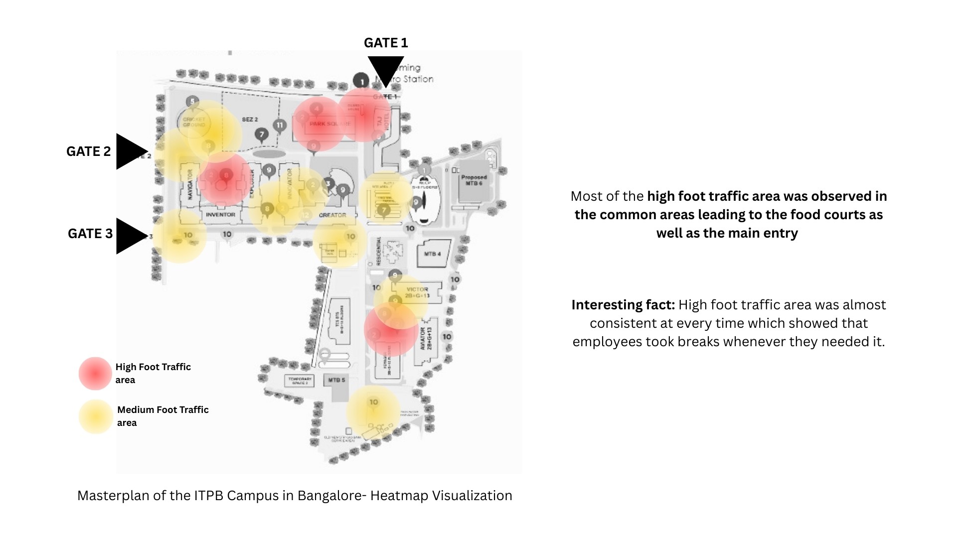 Tracked foot traffic patterns during peak hours (entry, lunch, tea breaks, exit)