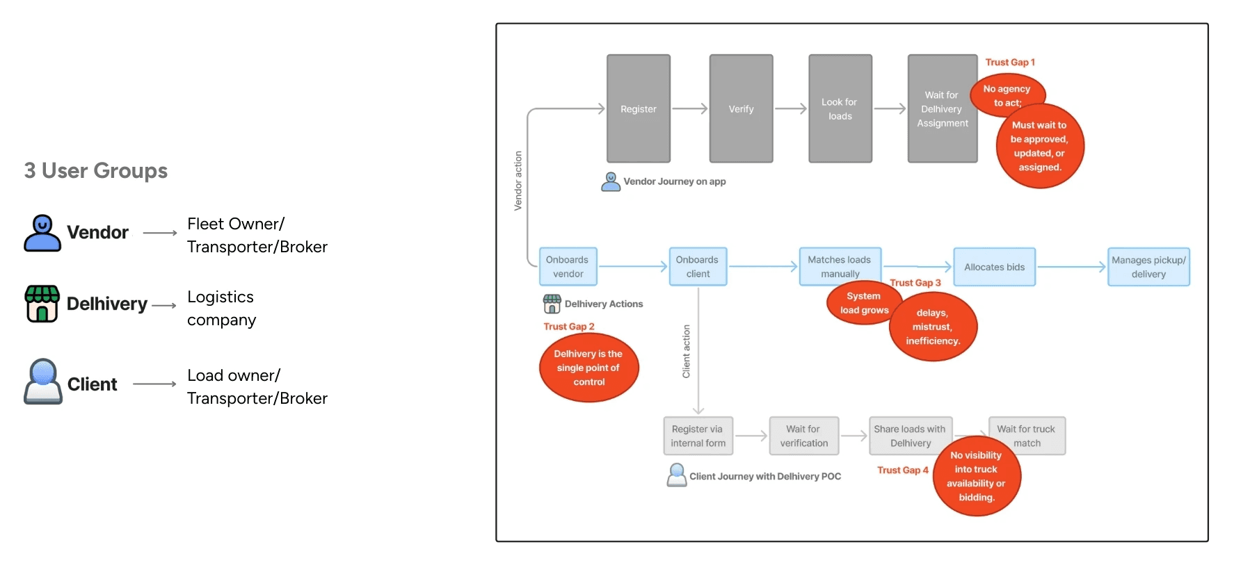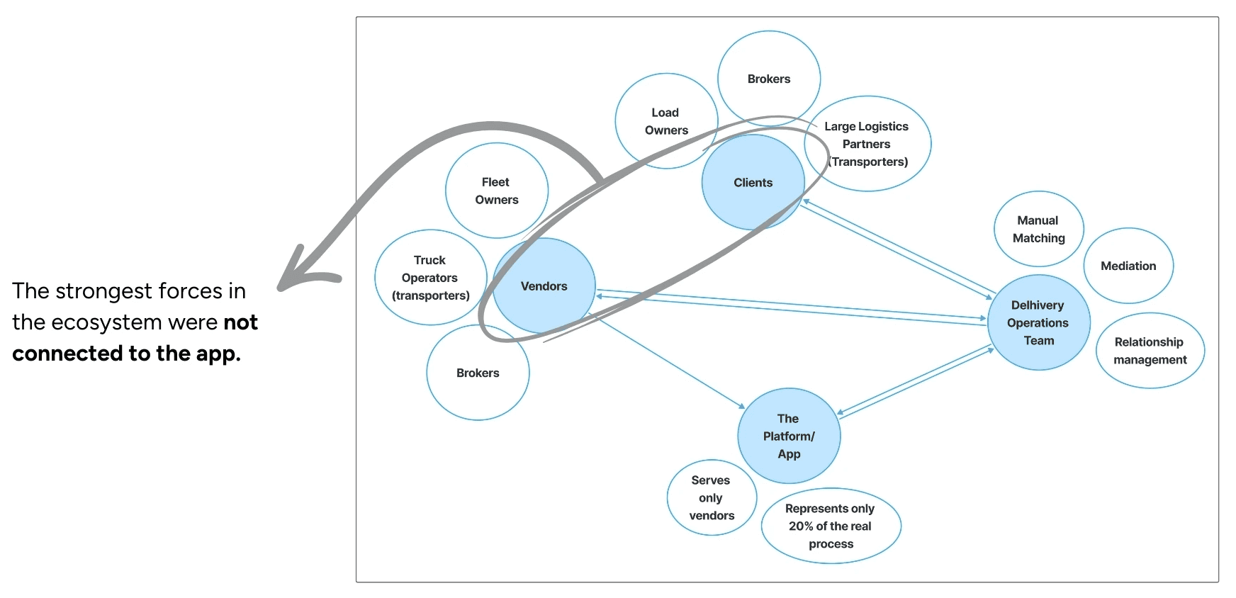 Shippers, brokers, & fleet owners on Delhivery's LoadBoard were routing critical transactions through WhatsApp groups, not because the app was broken, but because it didn't give them enough control to trust it. Platform mediation had created a system that worked for operations teams, not for the people doing the actual work.