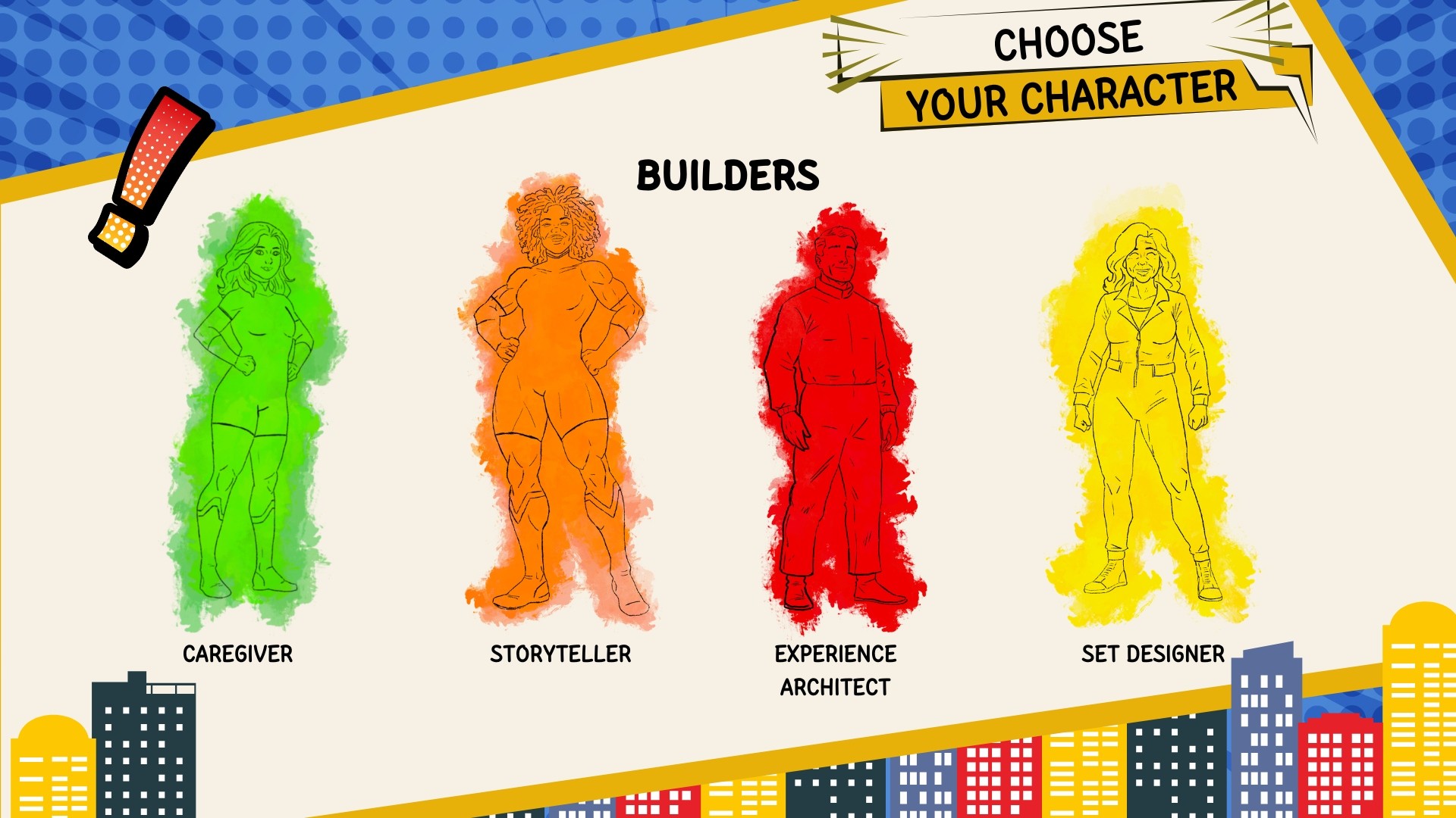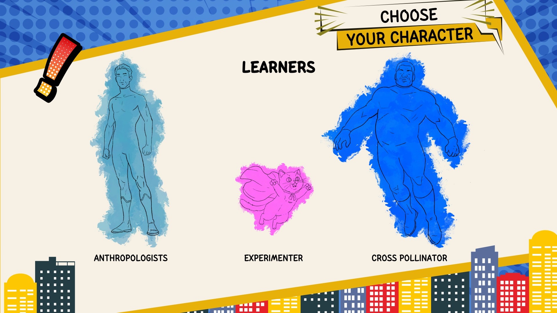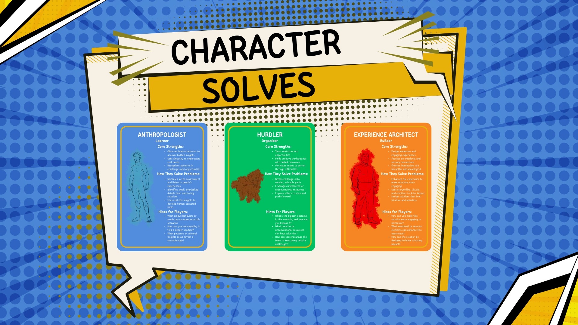 The character sheets- Visually communicates the Ten Faces of Innovation framework and the role-based architecture by CJ