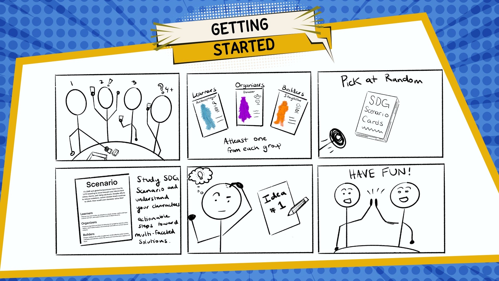 Six-step game mechanics — from team assembly to ideation, designed for groups of 4–10 BY CJ